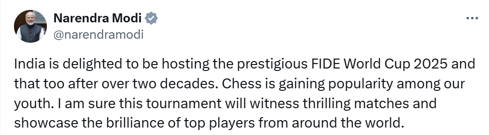 “India is delighted to be hosting the prestigious FIDE World Cup 2025 and that too after over two decades. Chess is gaining popularity among our youth. I am sure this tournament will witness thrilling matches and showcase the brilliance of top players from around the world.”