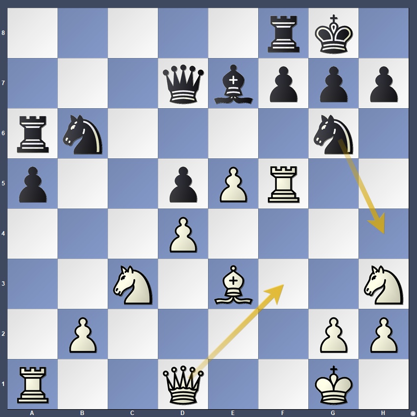 Bartel’s 20.Qf3?? allowed 20…Nh4, a double attack that forced immediate resignation.