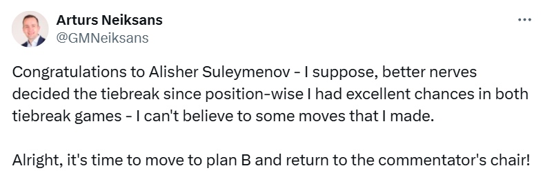 Elsewhere, GM Alisher Suleymenov (2491, Kazakhstan) defeated GM Arturs Neiksans (2585, Latvia), while GM Denis Makhnev (2525, Kazakhstan) ousted GM Diego Flores (2563, Argentina) winning by the same margin.
