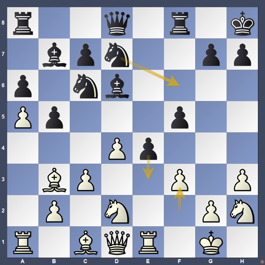 At this point, the 2023 World Cup finalist Praggnanandhaa had just played 17.f3, directly challenging the pawn on e4. Dubov invested nearly half of his remaining time calculating the sharp pawn sacrifice 17…e3, intending to follow up with 18…Ne7–d5, a sequence that could have given him excellent compensation and attacking chances.