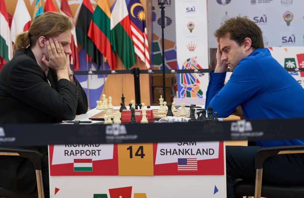 The encounter between GM Sam Shankland (2654) and GM Richard Rapport (2724) was a model of precision, a solid and balanced struggle with barely a hint of inaccuracy from either player. Though Shankland was perhaps a touch on the defensive side, he was never in real danger, and the draw was a logical outcome of sound, careful play from both sides.
