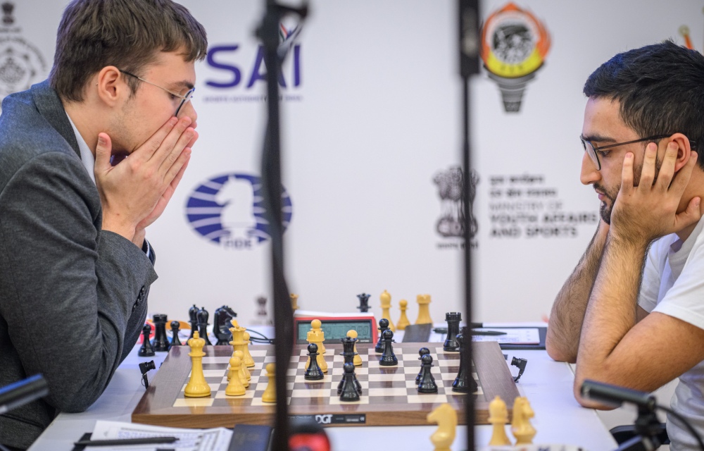 The encounter between GM Pranav V (2641) and GM Nodirbek Yakubboev (2689) was an exemplary display of accuracy and discipline, but lacked any real fireworks. After 80 moves of near-perfect play, neither side erred, and the game was drawn by repetition.