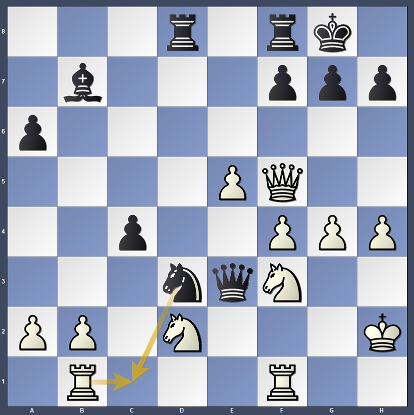 Black is already completely winning here. Esipenko continued with 24…Nc1, inviting the mistaken 25.Rxc1 (which occurred in the game), and then followed with 25…Rxd2+ 26.Kg3 Qe2. White could delay but not prevent the impending checkmate.